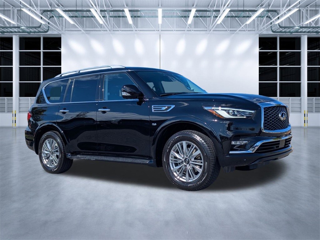 2018 INFINITI QX80 Base RWD 7-Speed Automatic 5.6L V8 120V Power Outlet, 13 Speakers, 2.94 Axle Ratio, 3rd row seats: split-bench, 4-Wheel Disc Brakes, ABS brakes, Activation Disclaimer, Air Conditioning, Alloy wheels, AM/FM radio: SiriusXM, Anti-whiplash front head restraints, Auto High-beam Headlights, Auto tilt-away steering wheel, Auto-dimming door mirrors, Auto-dimming Rear-View mirror, Auto-leveling suspension, Automatic temperature control, Backup Collision Intervention (BCI), Blind Spot Intervention (BSI), Blind Spot Warning, Brake assist, Bumpers: body-color, CD player, Delay-off headlights, Driver Assistance Package, Driver door bin, Driver vanity mirror, Dual 8" Color Monitors, Dual front impact airbags, Dual front side impact airbags, Electronic Stability Control, Emergency communication system: INFINITI Connection, Four wheel independent suspension, Front anti-roll bar, Front Bucket Seats, Front Center Armrest, Front dual zone A/C, Front fog lights, Front reading lights, Fully automatic headlights, Garage door transmitter: HomeLink, Genuine wood console insert, Genuine wood dashboard insert, Genuine wood door panel insert, Heated 2nd-Row Seats, Heated door mirrors, Heated Front Bucket Seats, Heated front seats, Heated steering wheel, Illuminated entry, Intelligent Cruise Control (Full-Speed Range), Lane Departure Warning System, Leather Shift Knob, Leather steering wheel, Leather-Appointed Seats w/Stratford Burl Trim, Literature Kit, Low tire pressure warning, Memory seat, Navigation System, Occupant sensing airbag, Outside temperature display, Overhead airbag, Overhead console, Panic alarm, Passenger door bin, Passenger vanity mirror, Power door mirrors, Power driver seat, Power Liftgate, Power moonroof, Power passenger seat, Power steering, Power windows, Radio data system, Radio: AM/FM/HD Single In-Dash CD/DVD Player w/MP3, Rain sensing wipers, Rear air conditioning, Rear anti-roll bar, Rear audio controls, Rear reading lights, Rear seat center armrest, Rear window defroster, Rear window wiper, Reclining 3rd row seat, Remote keyless entry, Roof rack: rails only, Security system, Speed control, Speed-sensing steering, Split folding rear seat, Spoiler, Steering wheel memory, Steering wheel mounted audio controls, Tachometer, Telescoping steering wheel, Theater Package, Tilt steering wheel, Traction control, Trip computer, Turn signal indicator mirrors, Variably intermittent wipers, Voltmeter, Wheels: 20" x 8.0" Split 6-Spoke Aluminum-Alloy, Wireless Headphones (2).